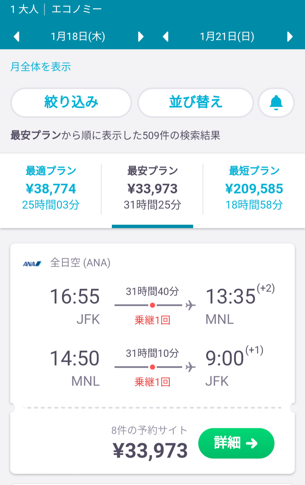 ANAでのニューヨーク-マニラ往復(羽田経由)が総額3万円台前半になっています。