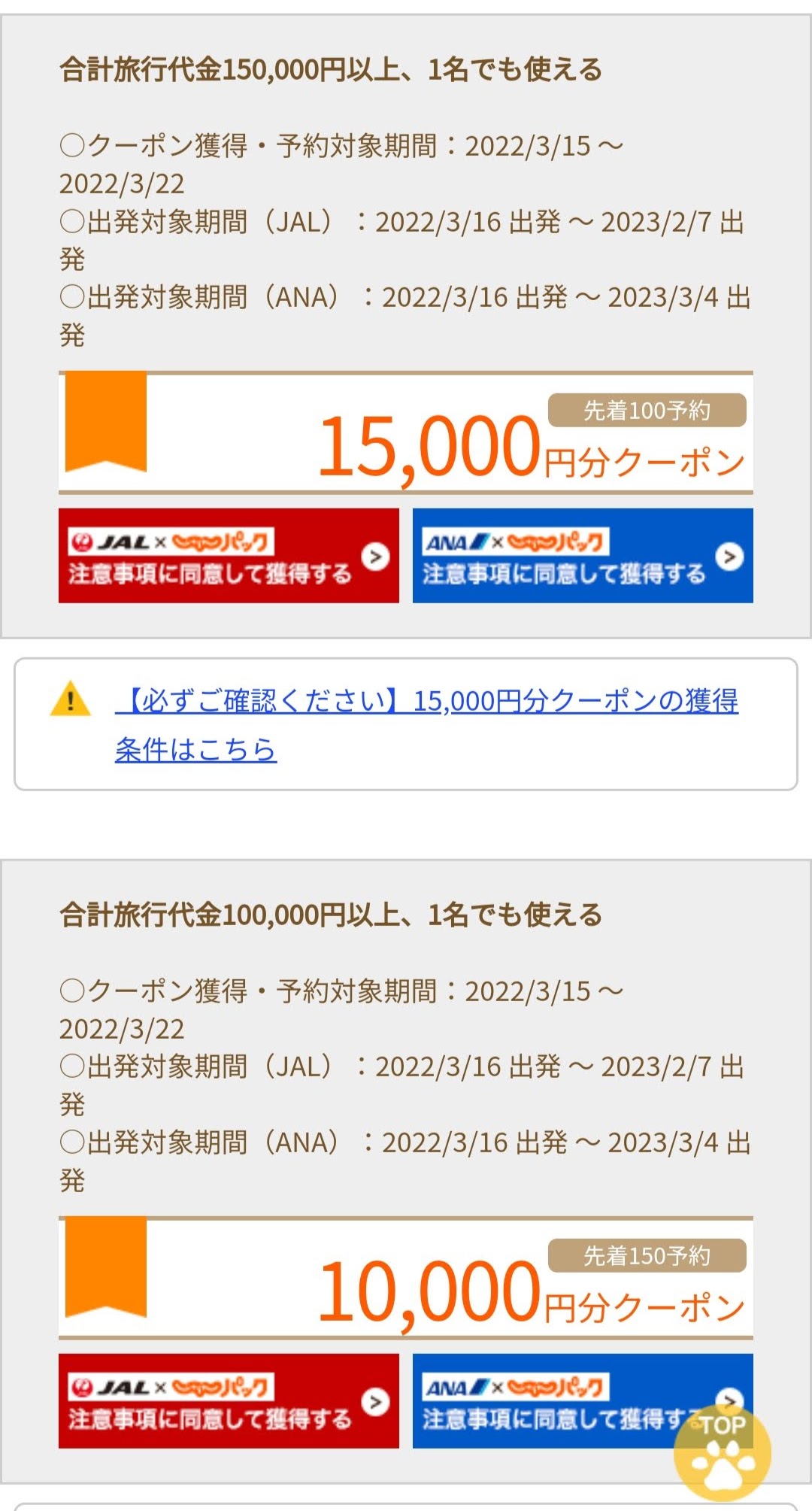 じゃらんパックは、たまに特定の旅行先が破格になったりすることもあって、クーポン利用条件満たさなくても最安になることも多いのでチェックしてみてください。